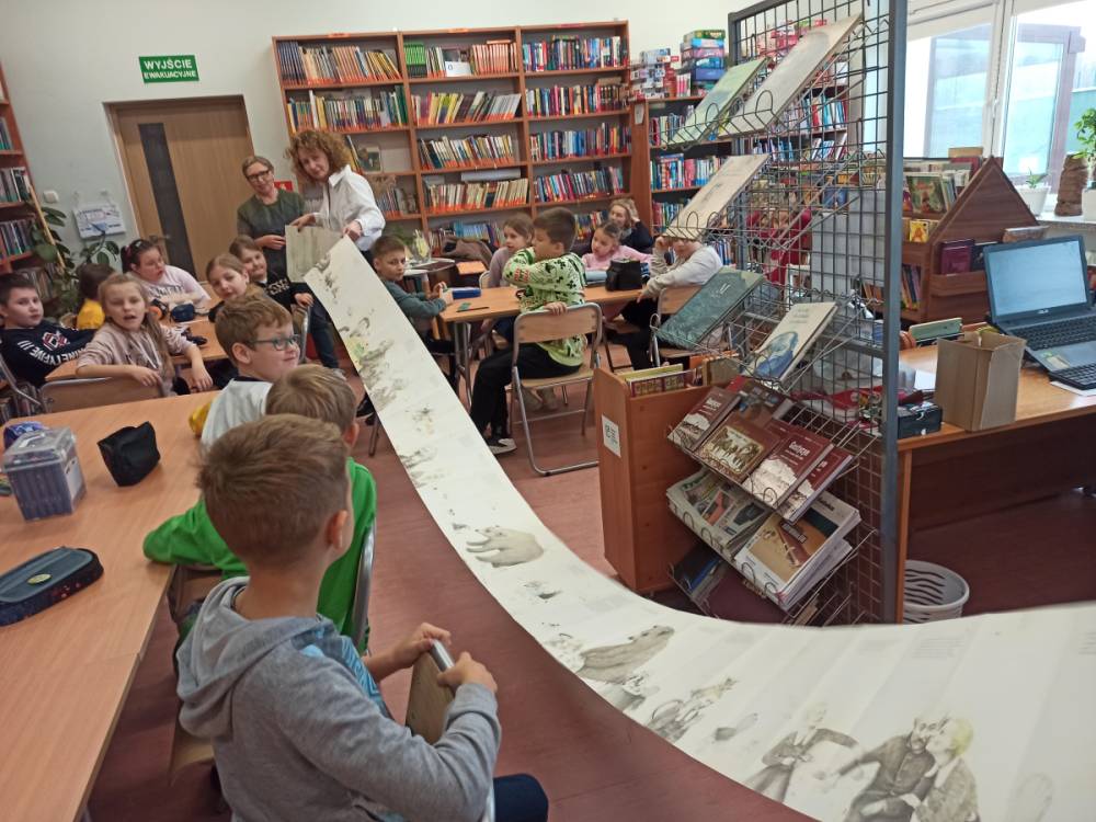 Następnie Joanna Concejo opowiedziała dzieciom o zawodzie ilustratorki, zdradziła, że ilustruje już 18 lat i wydała 20 książek. Część z nich znajduje się w zbiorach biblioteki, a wśród nich m.in. niezwykle ciekawa pod względem edytorskim książka "Książę w cukierni", która ma formę harmonijki i po całkowitym rozłożeniu mierzy aż 6 m 70 cm.