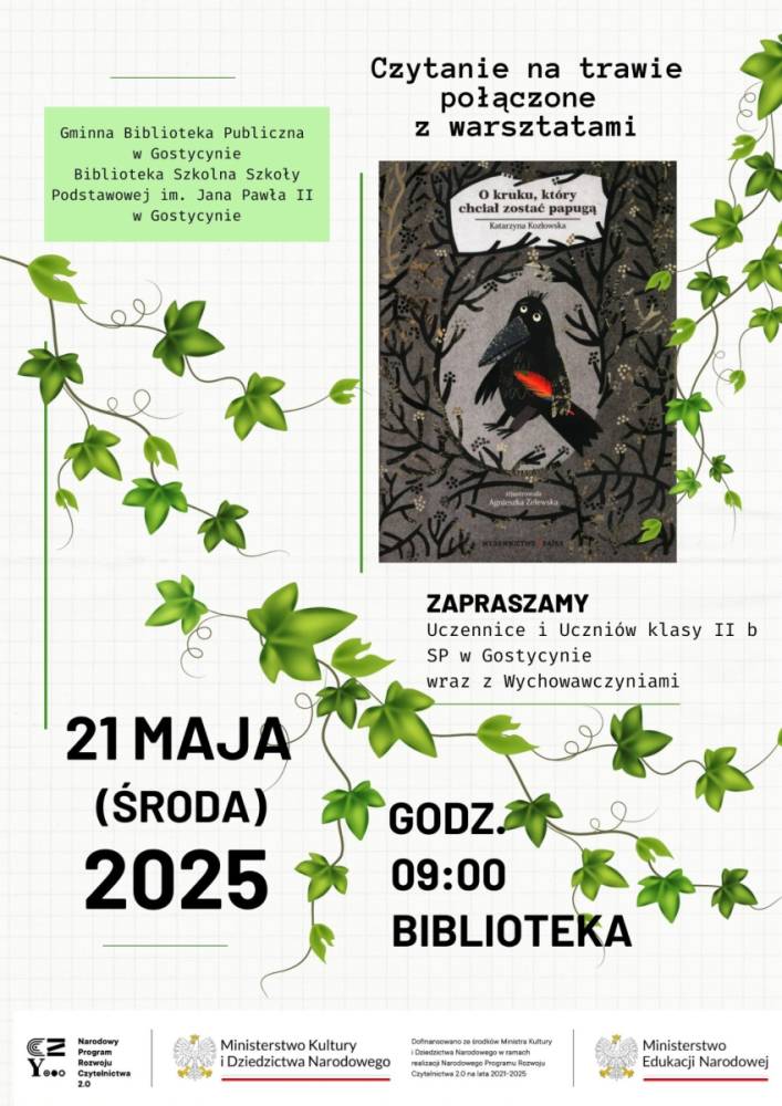 Zapraszamy serdecznie klasę II b, wraz z wychowawczynią, panią Małgorzatą Kołomyjską oraz panią Anną Brząkałą, na warsztaty w bibliotece na podstawie książki "O kruku, który chciał być papugą". Jeśli pogoda dopisze, połączymy je z czytaniem na trawie.
