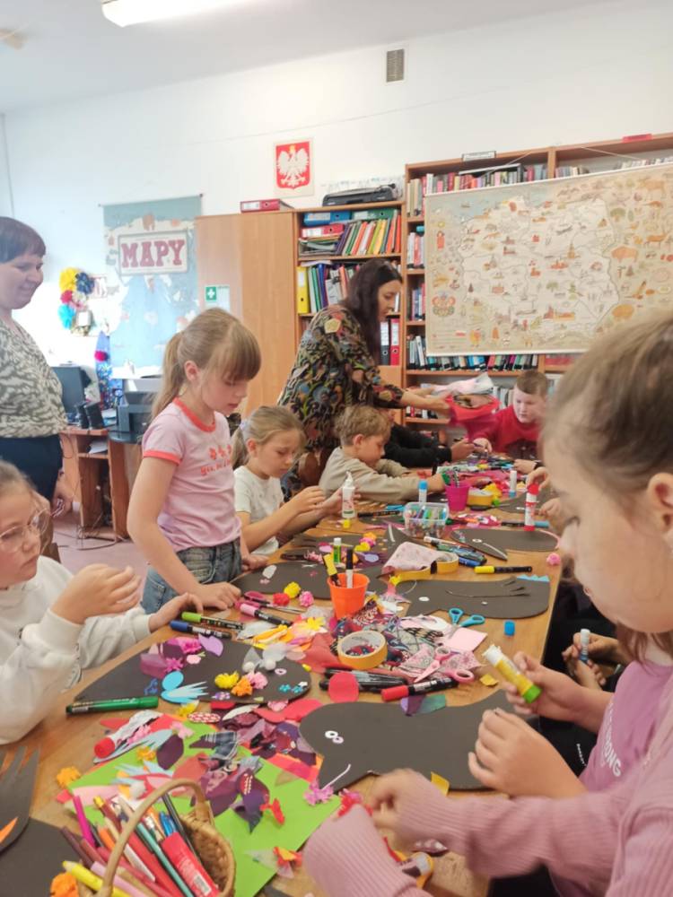 Z pomocą przyjaciół przybiera zupełnie nową postać. Uczennice i uczniowie klasy II a również ozdobili swoje czarne, kartonowe kruki. Użyli do tego: cekinów, kolorowych tkanin, materiałowych i papierowych piór, flamastrów, które rysują po czerni, koronek i bibułkowych kwiatów. Zobaczcie, jak im pięknie wyszły.